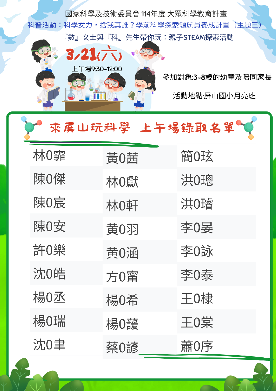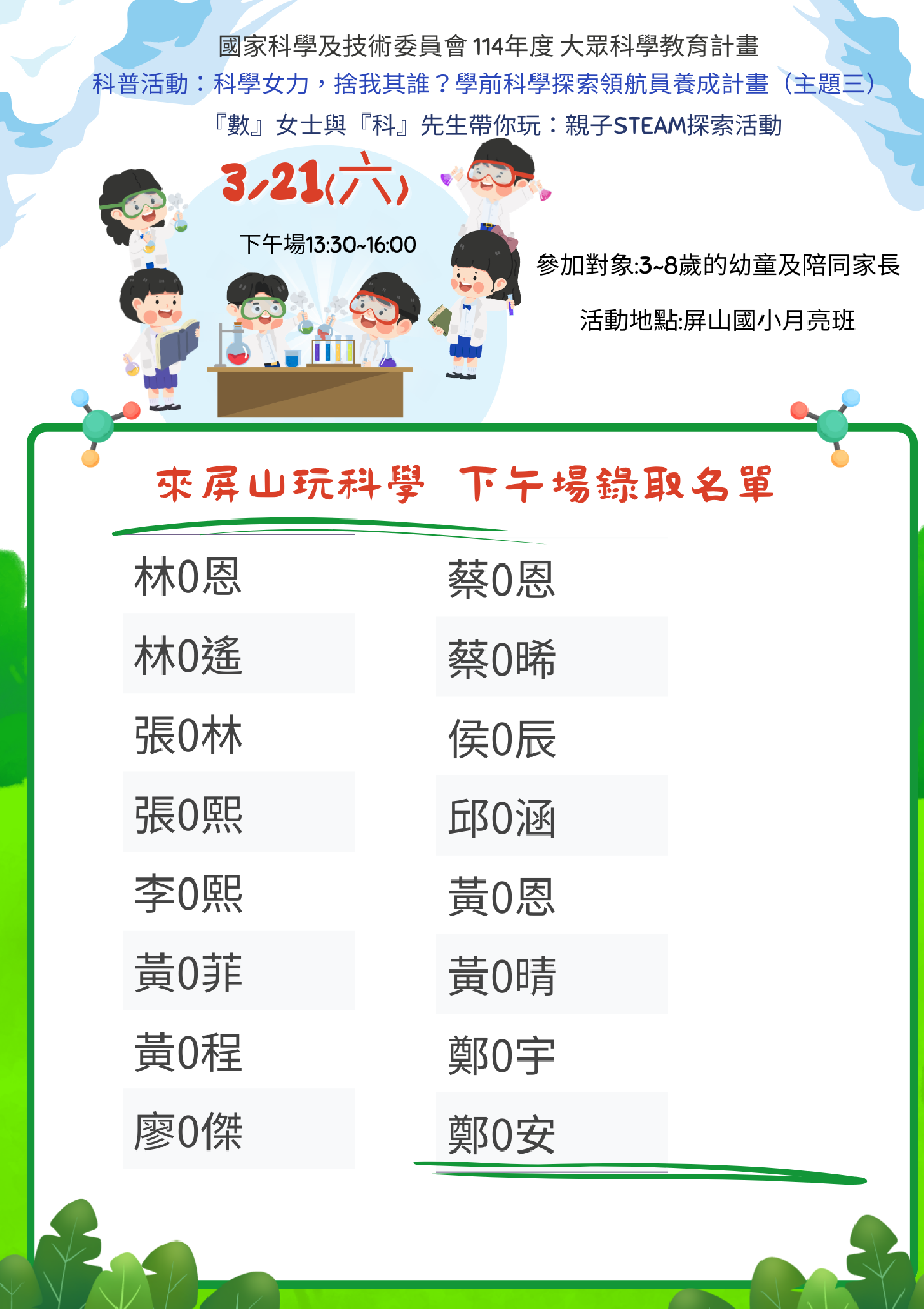 115年3月21日國科會舉辦之親子科學活動錄取名單